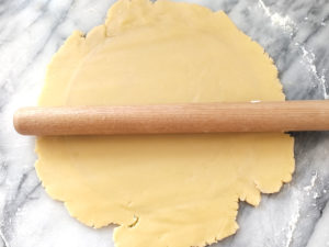 ![]() 10:パイ生地は1/3(ふた用)と2/3(型用)に分けます。 11:冷蔵庫から、生地を取り出したら、型の底板を台の上に乗せ、その上で、パイ皿より一回り大きくなるまで伸ばしましょう。 |