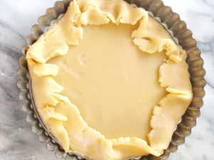![]() 16:蓋用に残しておいた生地を薄く伸ばし(型の直径よりやや大きく)、そっと上にかぶせましょう。 17:型の縁に沿って、手で軽く押さえて、生地を切り取ります。 (蓋も型用も生地はギリギリサイズです。) |