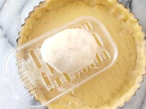 ![]() 14:生地を型に敷いたら、冷凍庫からマジパンを取り出し、おろし金ですりおろしたものを、生地の底に敷き詰めながら、平らにします。 |