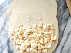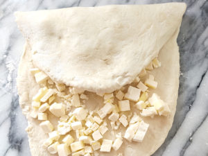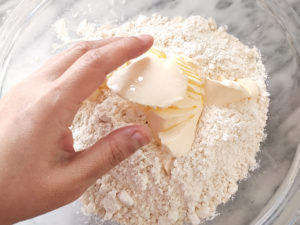 生地のバターは使う前に冷凍庫で冷やして置き、おろし金ですりおろすか、細かく刻んで中に折り込みます。