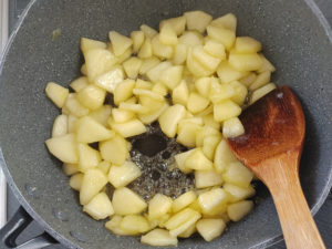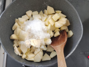 ![]() 11:フライパンにりんご、上白糖、フィリング用の有塩マーガリン、レモン汁を加えて火にかけましょう。 |
