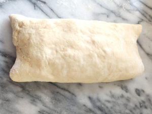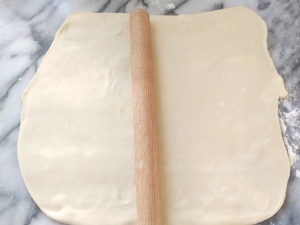 ![]() 9:生地を冷やしてから30分経ったら、同じように、長方形に伸ばして3つに折りたたむ作業を2回繰り返し、再度冷蔵庫で30分冷やしましょう。 |
