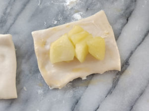 ![]() 15:長方形の生地を一つ取り、軽く伸ばしてから、甘煮のリンゴを中央に乗せます。 |