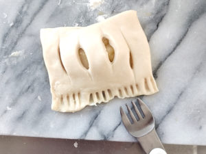 ![]() 16:もう一枚の生地にルレットや包丁などで4本線の切れ目を入れ、りんごの生地にかぶせたら、接着の意味も兼ねて、フォークの背で模様をつけましょう。 17:個数分繰り返します。 |