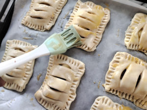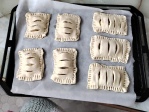 ![]() 18:天板にクッキングシートを敷き、少し間隔を空けて、パイを並べます。 |
