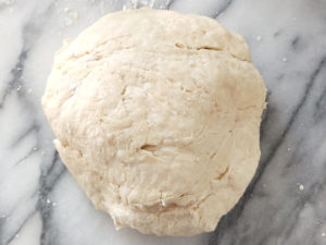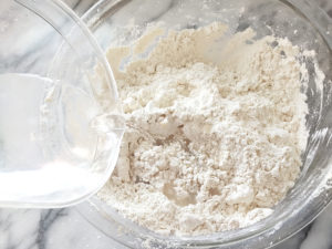 ![]() 2:冷水をボールにまず半量加えて手でこね、数回に分けて水を加えながら捏ねて、まとまったら、強力粉を少量(分量外)振った台の上に出しましょう。 |