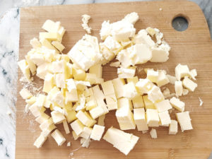 ![]() 4:冷凍の無塩バターを取り出し、包丁などで細かく刻みます。 (冷凍のバターなら、おろし金でもすりおろせますが、今回はカットしました。) |