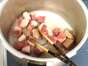⑤圧力鍋にサラダ油大1(分量外)を引き、牛肉の両面に軽く焼き色をつけます。