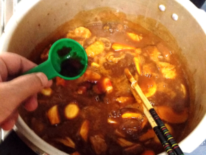 ⑥圧力鍋に、水、赤ワイン、ドミグラスソースを入れて、強火で3分ほど煮込み、アルコールを飛ばします。