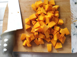 2:南瓜は少し大きめに切って、皮を切り落としてから、8mmほどの角切りにしましょう。