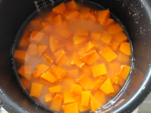 南瓜の皮を取っておけば、炊飯器で柔らかくなるので、すぐに作業に移れます。