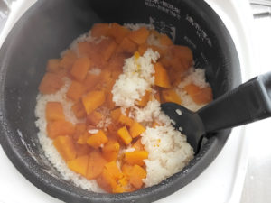 4:上に、南瓜が重ならないように散らしたら、炊飯器で普通に炊きましょう。