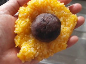 9:ご飯が冷めたら、100gほど生地を手に取り、丸くしてから平たくつぶし、中央にあん玉を置いて包みます。
