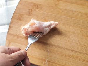 フォークで穴をあけておくと、味が染みやすくなり、焼く時にも火が通りやすくなります。