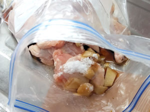 ![]() 2:ZIPロックの袋などに、砂糖、みりん、酒、醤油、手羽元を入れ、口を閉じて、袋の上からもみこみましょう。 |