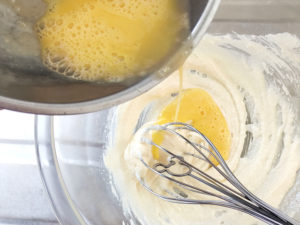 ![]() 2:溶き卵を4回に分けて加え、その都度よく混ぜます。 (一気に加えると分離します。) |