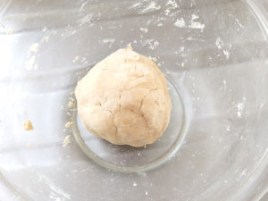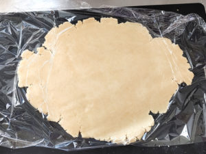 ![]() 7:台の上に生地を乗せたら、ラップをかけて、めん棒で5mm厚さに伸ばしましょう。 |