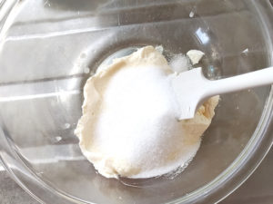 2:クリームチーズをボールに入れてゴムベラで練り、なめらかなクリーム状になったら、砂糖を加え、ザラザラ感が消えるまでしっかりと混ぜましょう。