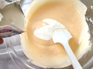 4:生クリームを4回~5回に分けてボールに加え、その都度滑らかになるまで混ぜましょう。