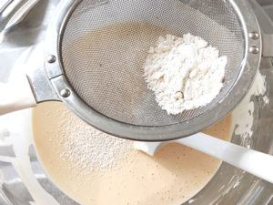 5:バニラエッセンスを加えて混ぜたら、薄力粉をふるい入れ、泡立て器に持ち変えます。