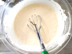 6:泡立てないように泡立て器を垂直に構えて、静かに混ぜ、粉っぽさがなくなるまで根気よく混ぜましょう。