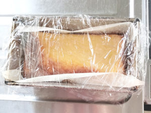 8:ケーキ型を振ると、表面が少しプルプルと揺れるくらいまで焼き、型に入れたままで粗熱を取りましょう。