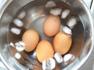 3:卵がゆであがったら、氷水を入れたボールに漬け込み、冷えてから、殻をむいておきます。
