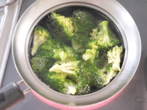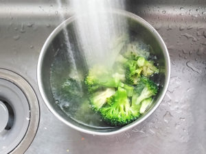 5:ブロッコリーはすぐに冷水にさらし、色止めをしたら、水気を切っておきます。