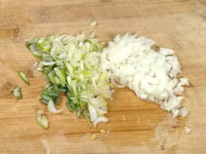 ![]() ①玉ねぎはみじん切り、長ねぎもみじん切りにしておきます。 |