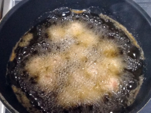 ![]() ④揚げ油を170~180度に熱し、先ほど丸めた団子を入れます。 (団子は、スプーンに乗せて入れると、油がはねません。) ⑤たねが浮き上がり、両面がこんがりとするまでしっかり揚げましょう。 |