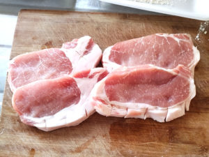 ![]() 1:豚肉は、身と脂身の間に垂直に切り込みを入れます。 (筋きりすると、揚げても縮みにくくなります。) |