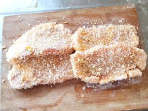 ![]() 2:豚肉に、薄力粉→衣用の溶き卵→パン粉の順に衣をつけましょう。 |