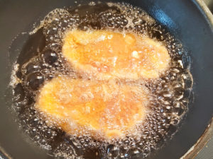 ![]() 3:180度~190度の油で、表面がきつね色になるまで揚げます。 (裏表で、3~4分ずつくらいが目安です。) |