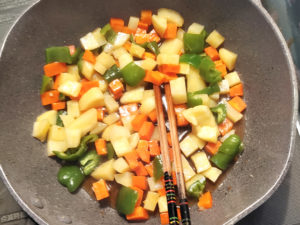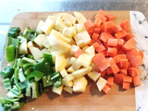 ![]() 6:じゃがいも、人参、ピーマンは同じくらいの大きさの、小さめの角切りにしましょう。 |