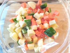 野菜類は火が通っていないと硬くて美味しくないので、長めにレンジにかけます。