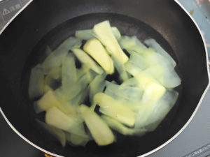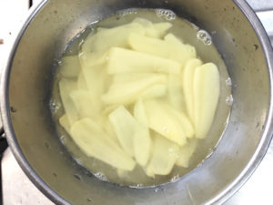3:鍋にお湯を多めに沸かし、スライスしたじゃがいもを入れて、1分ほどゆでます。