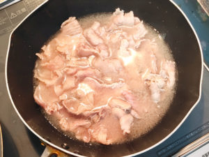 5:じゃがいもをゆでたお湯で、豚肉を白くなるまでしっかり目に火を通し、ゆだったら、水気を切ります。
