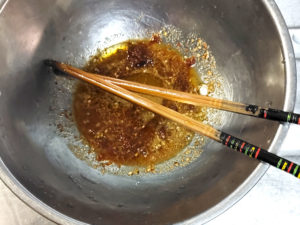 6:別のボールに、醤油、砂糖、りんご酢(普通の酢でもOK)、豆板醤、すりごまを入れてよく混ぜ、ドレッシングを作りましょう。