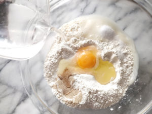 1:少し大きめのボールに、強力粉、砂糖、塩、ドライイースト(塩の反対側に)、卵、お湯を注ぎ入れて、手でまとまるまで捏ねます。