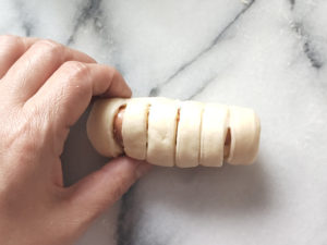 10:カードかスケッパーを使い、ソーセージに対して垂直になるように、縦に6本の線を描きましょう。