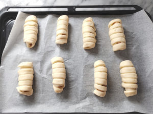 12:天板にクッキングシートを敷き、成形した生地を間隔を空けて並べましょう。