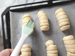 13:溶き卵を用意し、生地1つずつに、卵を刷毛で塗ります。
