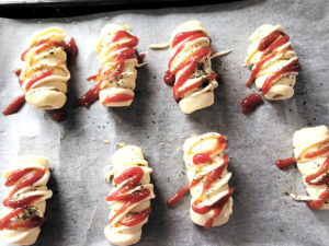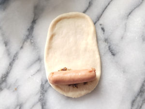 9:生地を一つ取り、めん棒で長方形に伸ばし、手前にマスタードを小1/2ほど塗り、その上にソーセージを乗せます。