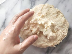 2:生地がだいたいまとまったら、台の上に出し、室温に戻したマーガリン(時短を狙うなら、レンジで10秒加熱)を挟むようにして捏ねましょう。