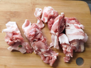 ![]() 3:豚こまは食べやすい大きさに切ります。 |