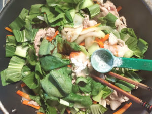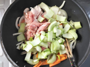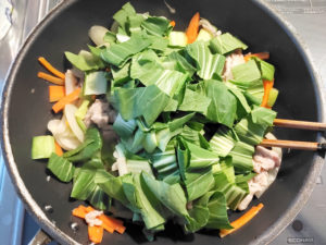![]() 4:テフロン加工のフライパンで、豚こま、玉ねぎ、人参、椎茸、チンゲン菜の芯の部分を入れて加熱し、玉ねぎがしんなりするまで炒めましょう。 |