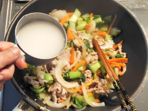 ![]() 7:一旦火を止めてから、合わせ調味料の片栗粉を水で溶いてフライパンに加え、全体にとろみがついたら、火を止めましょう。 (加熱しながらだと、片栗粉がダマになります。) |