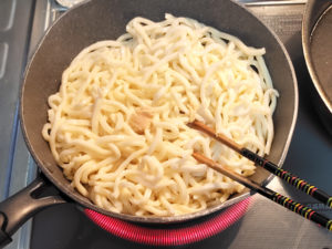 ![]() 9:別のテフロン加工のフライパンにごま油を熱し、うどんと焼うどん用のウェイパーを加えて、うどんが柔らかくなり、火が通ったらOK。 |