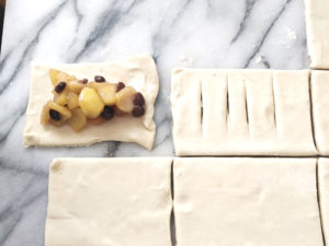 ![]() 14:長方形の生地を一つ取り、軽く伸ばしてから、甘煮のリンゴ類を中央に多めに乗せます。 |