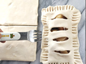 ![]() 15:もう一枚の生地にルレットや包丁などで4本線の切れ目を入れ、りんごの生地にかぶせたら、接着の意味も兼ねて、フォークの背で模様をつけましょう。 16:個数分繰り返します。 |